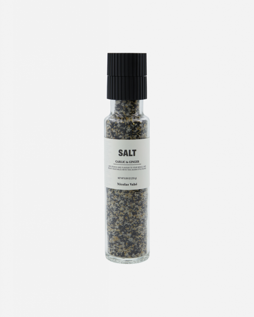 Gourmetvarumärket Nicolas Vahé har skapat en serie av olika salter med spännande smaker och kryddor, som passar perfekt till alla sorters matlagning. Saltkvarn, Havssalt med vitlök och ingefära från danska Nicolas Vahé. Ger en kulinarisk exotisk upplevelse, en oförglömlig matupplevelse. Förvandla dina soppor och grytor med denna kvar innehållande ingefära och svart sesamsalt. En touch av vitlök som vitaliserar alla recept med en asieninspirerad smak. Den inbyggda malen ger en finmald krydda och frigör goda oljor för en explosion av arom och smak i dina rätter.