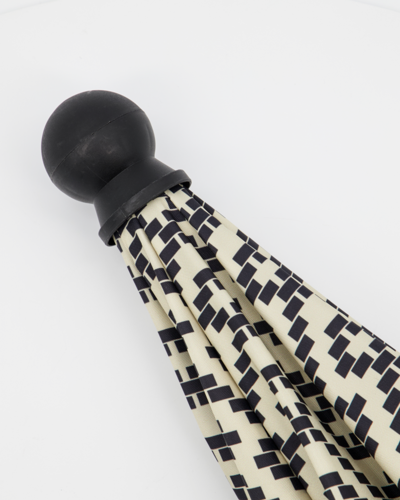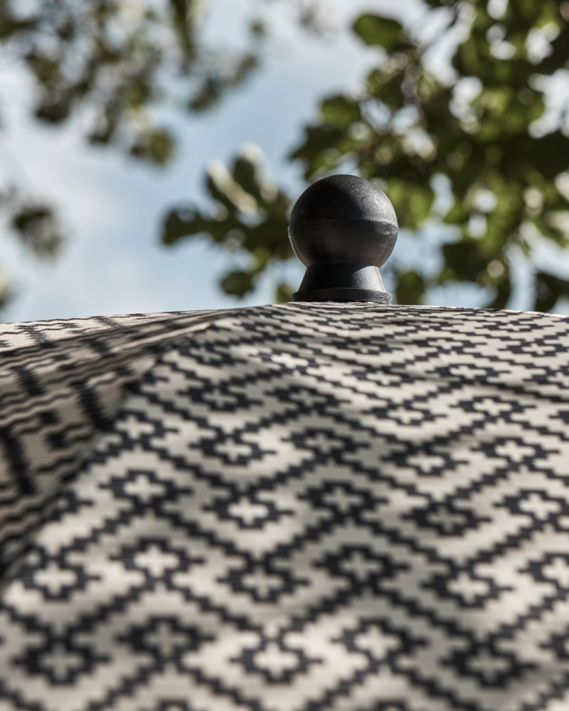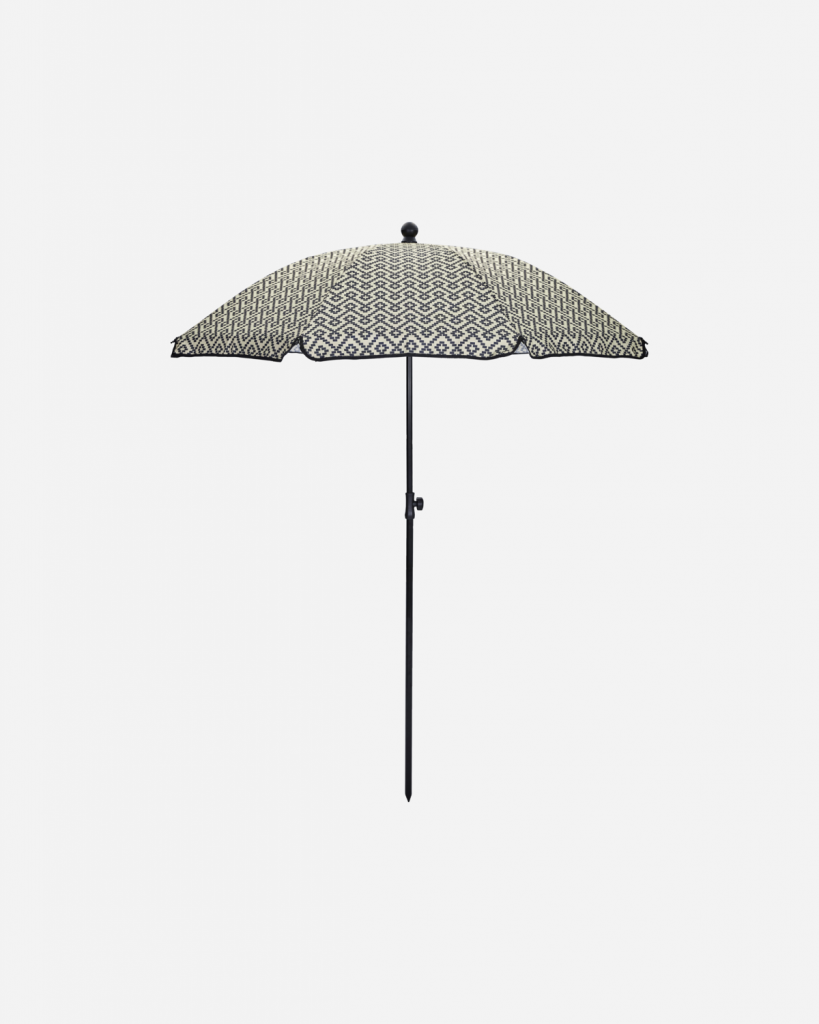 Snyggt solparasoll i en geometriskt mönster i beige och svart från danska House Doctor. Vattenavvisande och går enkelt att justera i höjd.